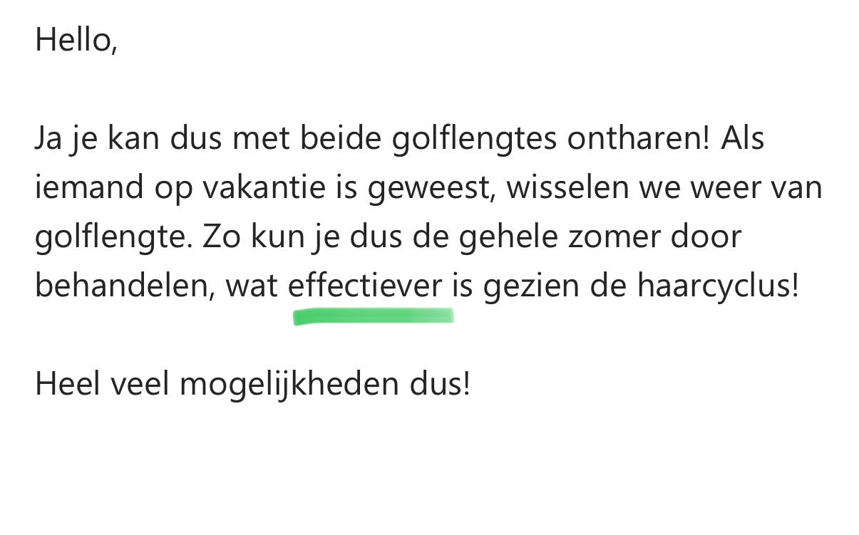 Deze laser is uniek op het vlak van technologie waardoor je minder sessies nodig hebt dan andere lasertoestellen. Je zal bij andere lasers vaak 8 à 10 sessies zien staan, terwijl dat bij deze laser 6 à 8 sessies is. Je kan soms zelfs als resultaat zien na 4 sessies. Gemiddeld zien we resultaat na 6 sessies. Bij stugge haren of gezichtsharen zien we het wel eens voorkomen dat je op 8x zit. Het resultaat ga je bij deze laser zelfs al zien na 3 of 4x, maar het is belangrijk dat je dan wel verder doet want dit heeft allemaal met de haarcyclus te maken. Onze haren zitten niet op hetzelfde moment in dezelfde haargroeicyclus. Om alle haren te targetten, hebben we meerdere sessies nodig. En dat is ook de reden voor de aantal weken er tussen. Bij de haren op het gelaat duurt de haarcyclus ongeveer 4-6 weken en de haren op het lichaam 8 weken. Indien we na 1 sessie al heel goed resultaat merken, dan bekijken we altijd of je minder dan 6 sessies nodig hebt.