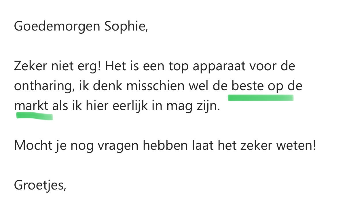 Dit toestel is erg duur door alle technologie erachter, maar ik wil gegarandeerd resultaat kunnen bieden. Natuurlijk zal iedereen beweren: ik heb het beste toestel, maar je mag gerust onderzoeken opzoeken.