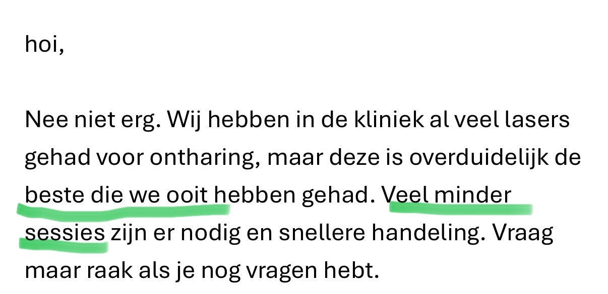 - Bewezen: minder sessies nodig dan andere lasers (zoals bijv. een diode laser)